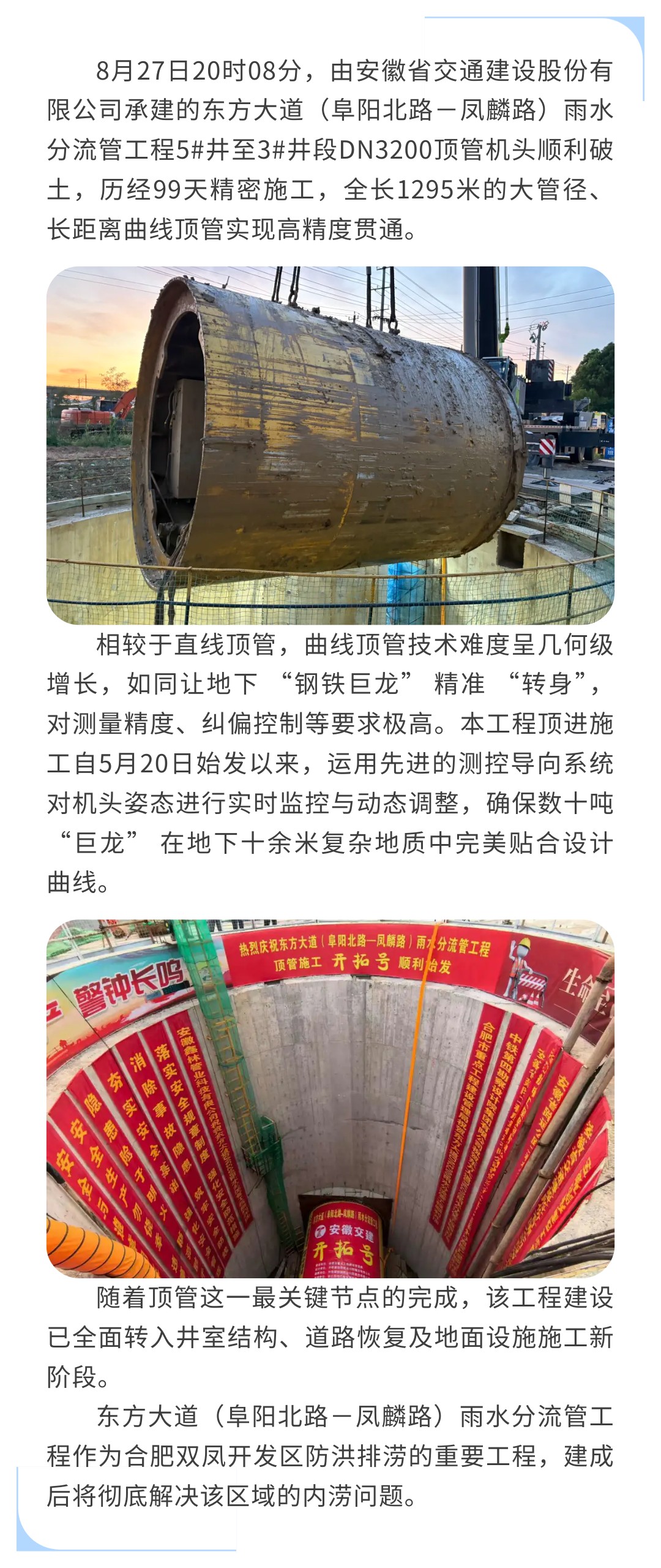 地下長龍“絲滑”過彎|東方大道(阜陽北路-鳳麟路)雨水分流管工程大管徑曲線頂管全線貫通