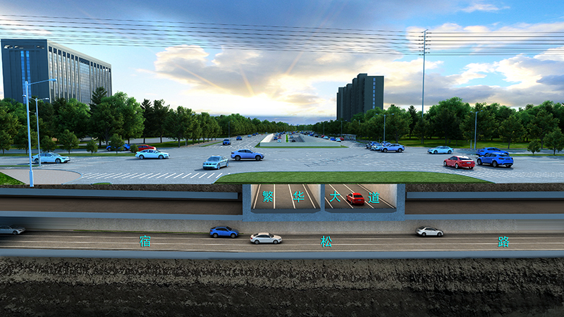 宿松路2標全長2815m,北起繞城高速,下穿壩下路、繁華大道、軒轅路,上跨花園大道、南至慈光路。宿繁交口新建雙層下穿隧道,宿松路隧道位于負二層,長1250m,繁華大道隧道位于負一層,長349m。新建花園大道跨線橋一座,長420m;同時,新建壩下路、智能科技園人行天橋2座。