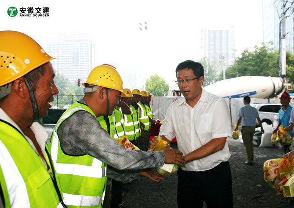 副市長(zhǎng)寧波向奮戰(zhàn)在高溫下的工程建設(shè)者們表示感謝,給安徽交建一線員工送去了仁丹、風(fēng)油精、肥皂、毛巾、礦泉水、綠豆等防暑降溫用品,并同現(xiàn)場(chǎng)的同志們一一握手。寧副市長(zhǎng)強(qiáng)調(diào)指出,當(dāng)前工程進(jìn)入大干階段,又值高溫時(shí)節(jié),希望項(xiàng)目施工方科學(xué)調(diào)度、合理安排,既保證工期,又確保安全生產(chǎn),防止發(fā)生高溫中暑等事件。嚴(yán)格落實(shí)防暑降溫措施,對(duì)從事高溫作業(yè)和戶外作業(yè)的員工,要制定合理的作息制度。相關(guān)部門要根據(jù)各自職責(zé),積極主動(dòng)地做好服務(wù)保障工作,保障好每一位建設(shè)者的人身安全和健康。在得知項(xiàng)目工程進(jìn)展順利后,寧副市長(zhǎng)還詳細(xì)地了解了工地的避暑措施,并再三囑咐現(xiàn)場(chǎng)負(fù)責(zé)人,要加強(qiáng)安全管理、合理安排施工、避免強(qiáng)高溫時(shí)段室外作業(yè)、保障職工身心健康,并在確保工程質(zhì)量和施工安全的基礎(chǔ)上,進(jìn)一步加快項(xiàng)目建設(shè)進(jìn)度,努力交上一份完美答卷。